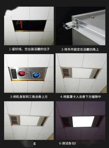 5. 安装浴霸:将浴霸挂在支架上,确保浴霸与支架固定牢固。